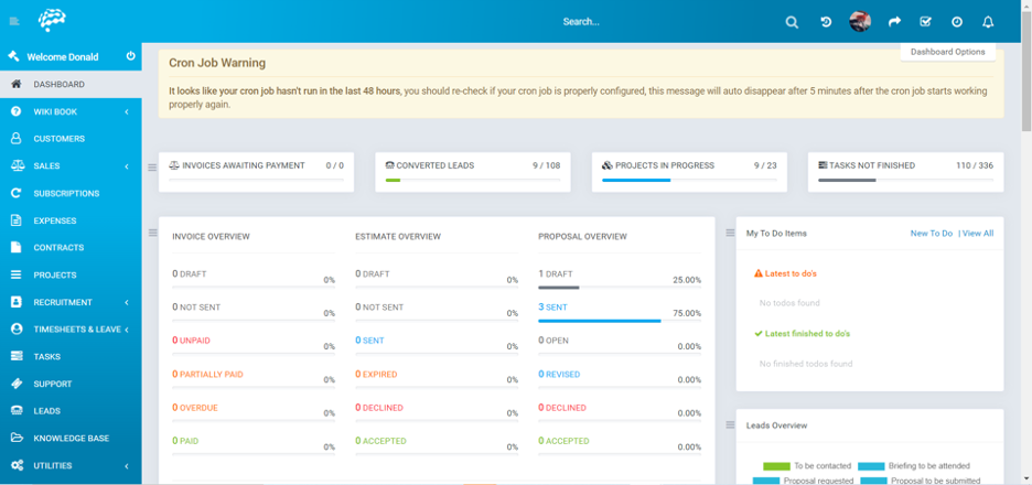 Keep track of leads in one place and easily follow their progress. Ability to auto import leads from email, add notes, and create proposals. Organize your leads in stages and change stages easily with drag and drop.